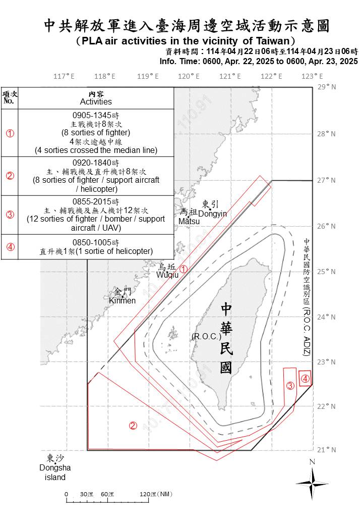迄0600時止,偵獲共機29架次(其中逾越海峽中線進入北部、西南及東部空域25架次)及共艦6艘、公務船2艘,持續在臺海周邊活動。國軍運用任務機、艦及岸置飛彈系統嚴密監控與應處。