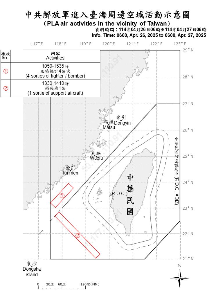 迄0600時止,偵獲共機5架次(其中逾越海峽中線進入西南空域1架)及共艦14艘、公務船1艘,持續在臺海周邊活動。國軍運用任務機、艦及岸置飛彈系統嚴密監控與應處。