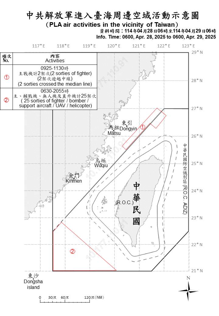 迄0600時止,偵獲共機27架次(其中逾越海峽中線進入北部及西南空域27架)及共艦9艘、公務船1艘,持續在臺海周邊活動。國軍運用任務機、艦及岸置飛彈系統嚴密監控與應處。