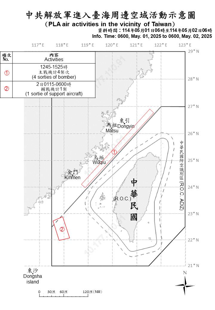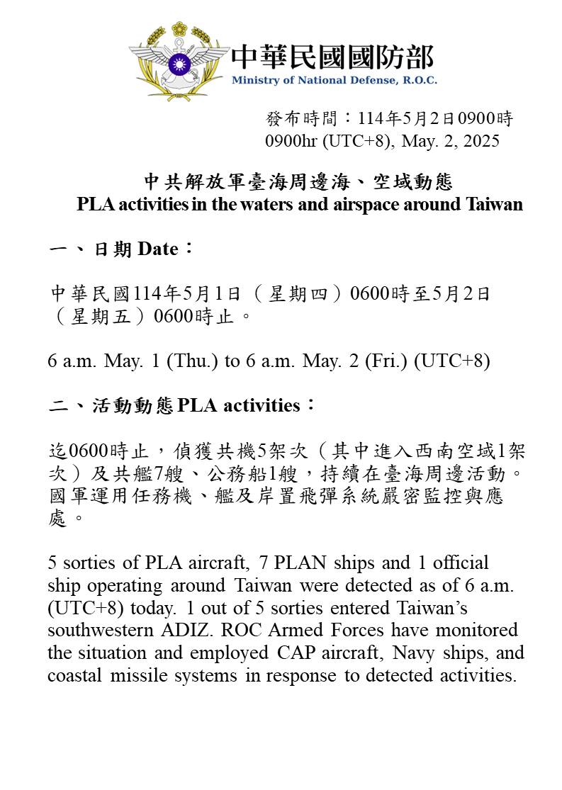 迄0600時止,偵獲共機5架次(其中進入西南空域1架次)及共艦7艘、公務船1艘,持續在臺海周邊活動。國軍運用任務機、艦及岸置飛彈系統嚴密監控與應處。
