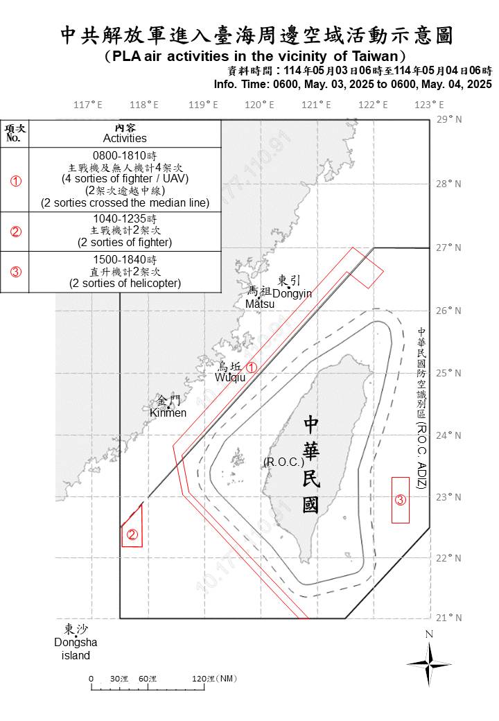 迄0600時止,偵獲共機8架次(其中逾越海峽中線進入北部、西南及東部空域6架次)及共艦7艘、公務船1艘,持續在臺海周邊活動。國軍運用任務機、艦及岸置飛彈系統嚴密監控與應處。