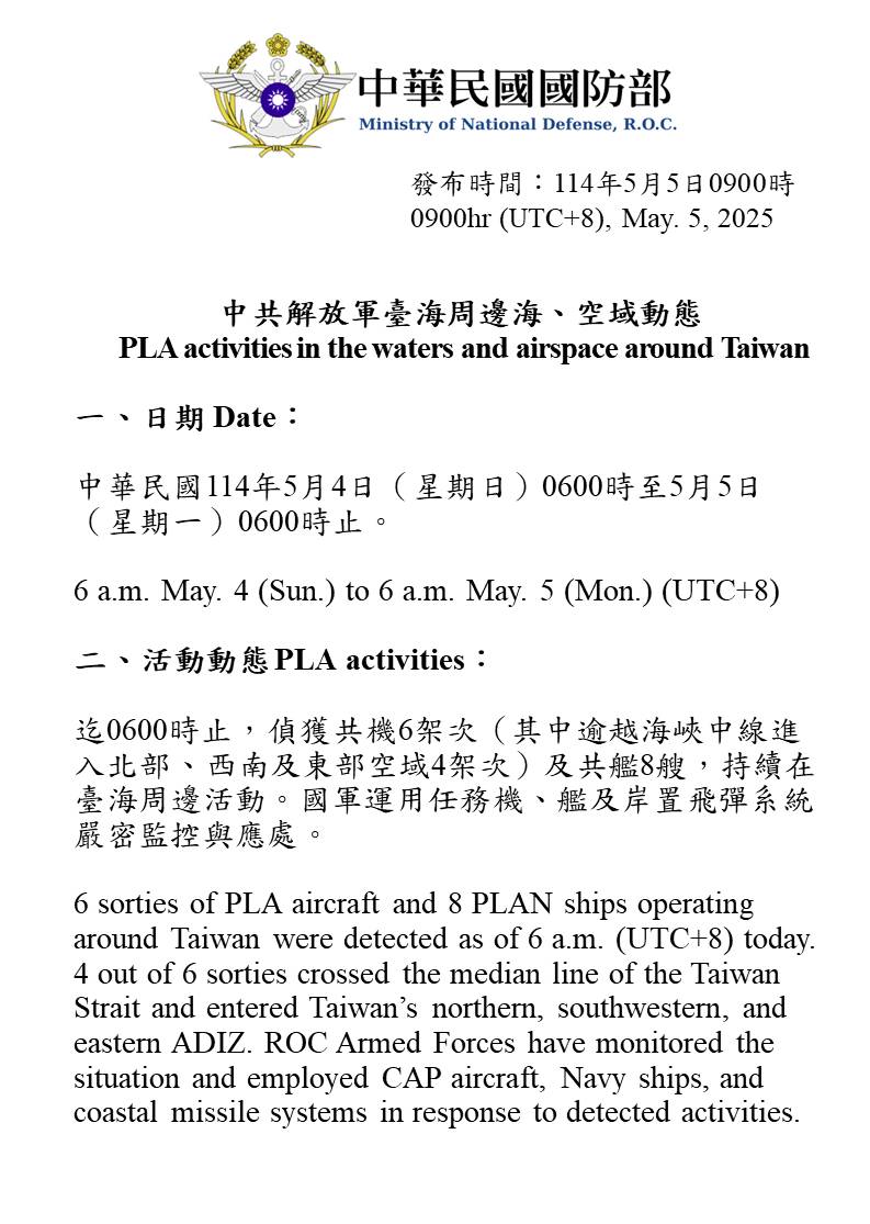迄0600時止,偵獲共機6架次(其中逾越海峽中線進入北部、西南及東部空域4架次)及共艦8艘,持續在臺海周邊活動。國軍運用任務機、艦及岸置飛彈系統嚴密監控與應處。