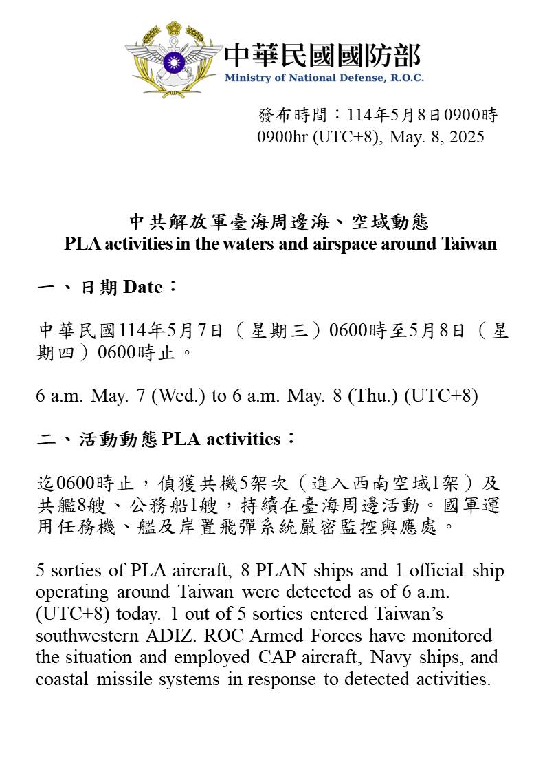 迄0600時止,偵獲共機5架次(進入西南空域1架)及共艦8艘、公務船1艘,持續在臺海周邊活動。國軍運用任務機、艦及岸置飛彈系統嚴密監控與應處。