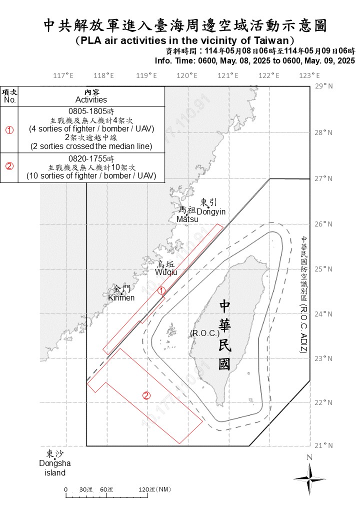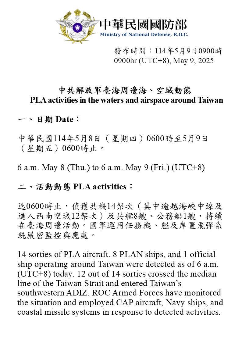 迄0600時止,偵獲共機14架次(其中逾越海峽中線及進入西南空域12架次)及共艦8艘、公務船1艘,持續在臺海周邊活動。國軍運用任務機、艦及岸置飛彈系統嚴密監控與應處。