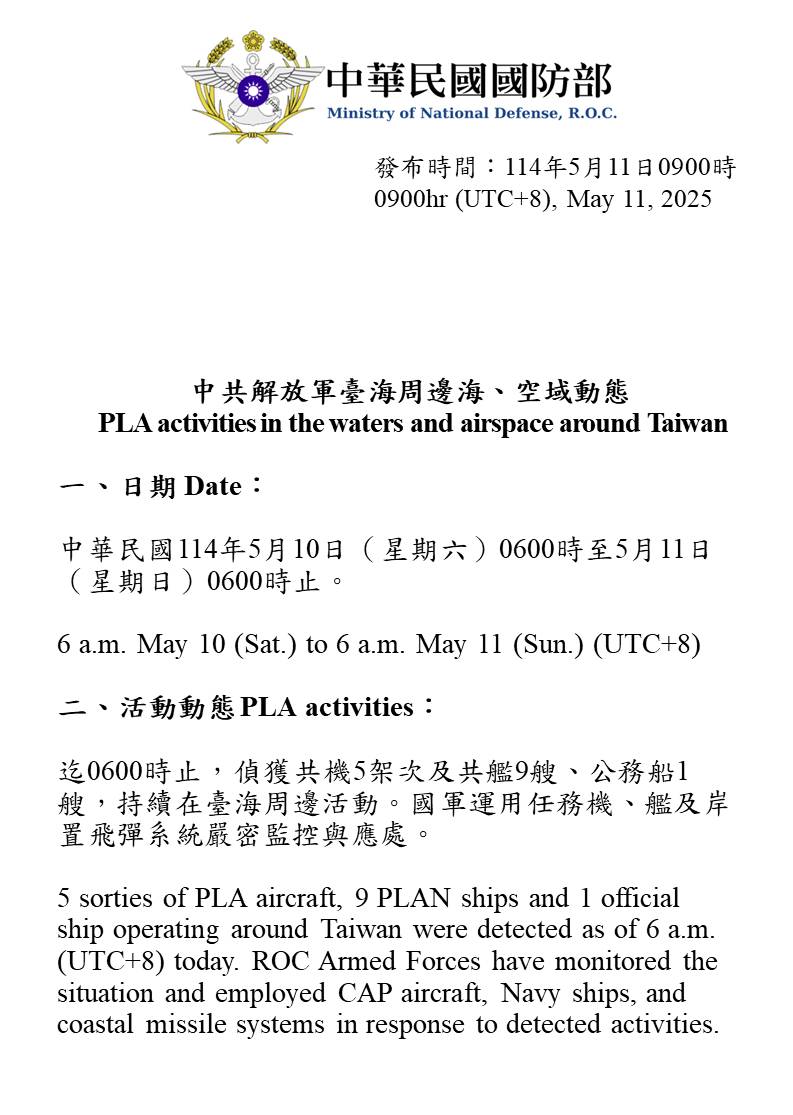 迄0600時止,偵獲共機5架次及共艦9艘、公務船1艘,持續在臺海周邊活動。國軍運用任務機、艦及岸置飛彈系統嚴密監控與應處。