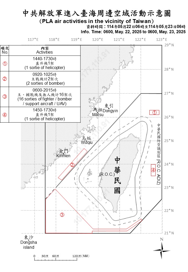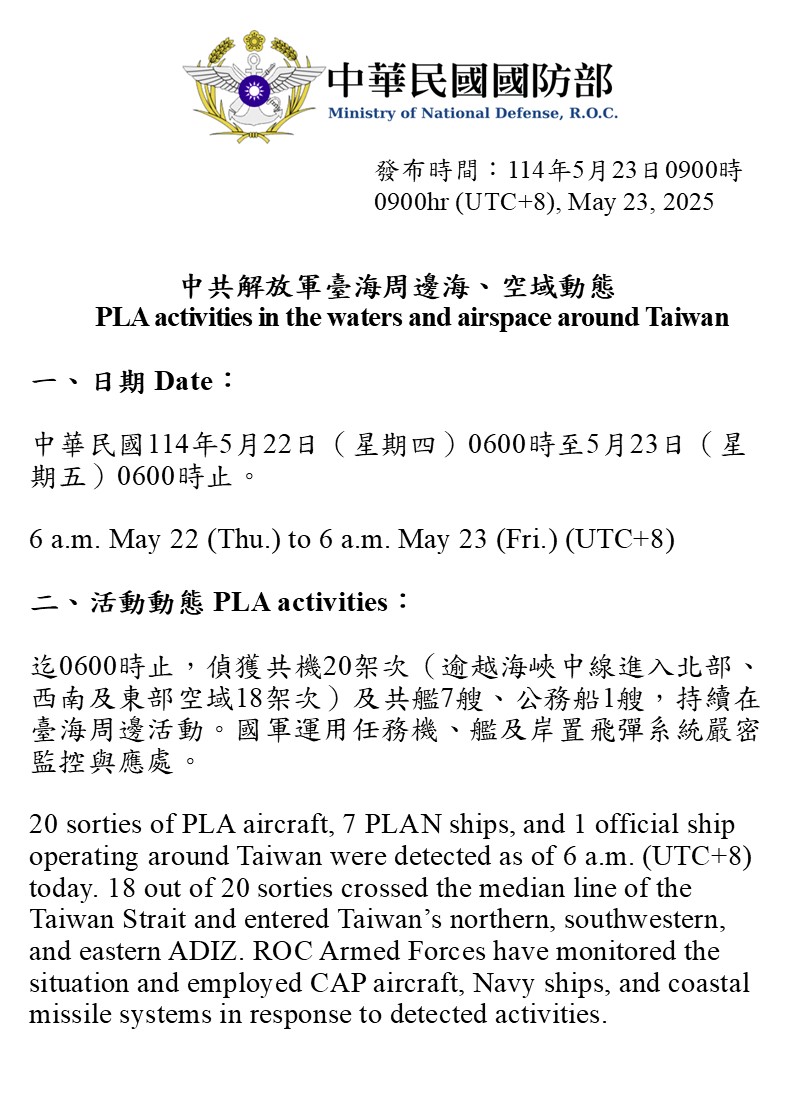 迄0600時止,偵獲共機20架次(逾越海峽中線進入北部、西南及東部空域18架次)及共艦7艘、公務船1艘,持續在臺海周邊活動。國軍運用任務機、艦及岸置飛彈系統嚴密監控與應處。