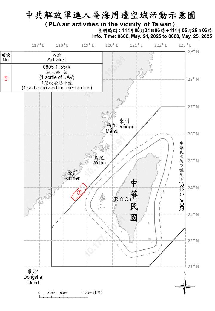 迄0600時止,偵獲共機1架次(其中逾越海峽中線1架次)及共艦7艘、公務船2艘,持續在臺海周邊活動。國軍運用任務機、艦及岸置飛彈系統嚴密監控與應處。