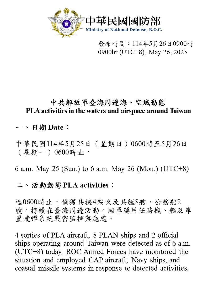 迄0600時止,偵獲共機4架次及共艦8艘、公務船2艘,持續在臺海周邊活動。國軍運用任務機、艦及岸置飛彈系統嚴密監控與應處。