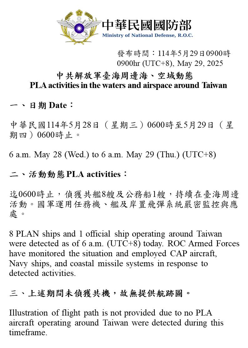 迄0600時止,偵獲共艦8艘及公務船1艘,持續在臺海周邊活動。國軍運用任務機、艦及岸置飛彈系統嚴密監控與應處。