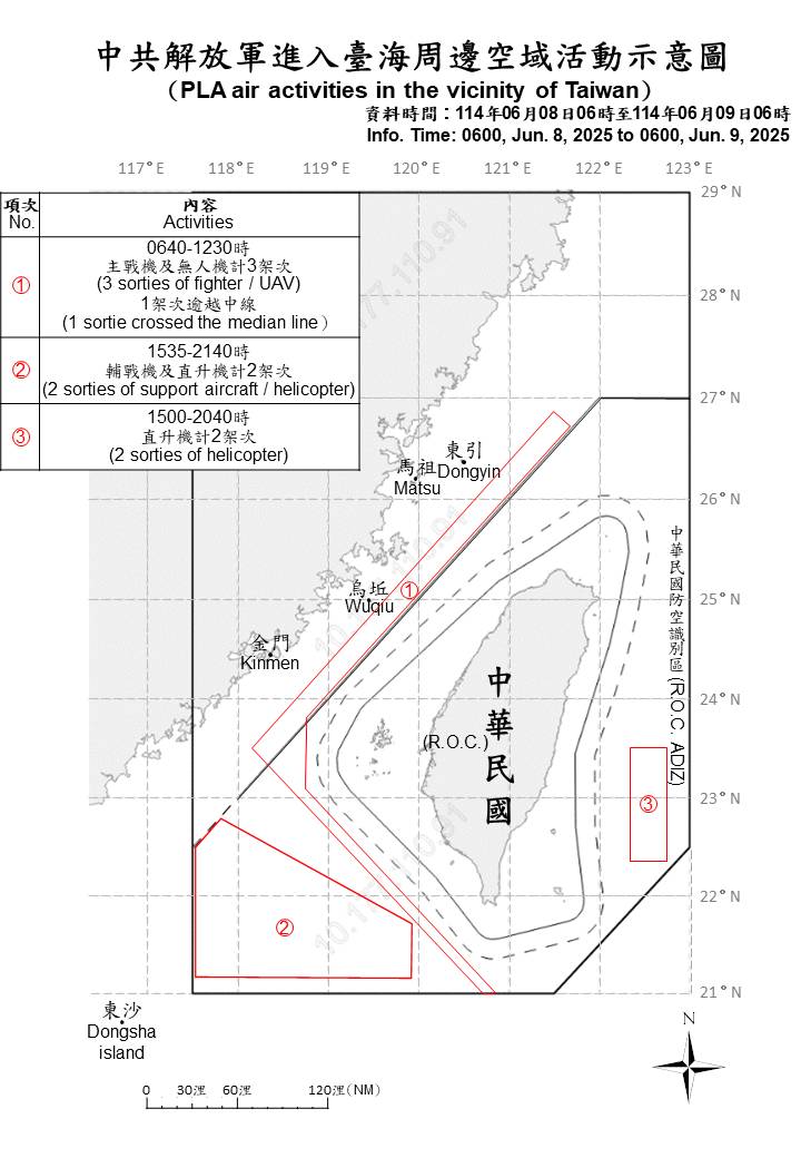 迄0600時止,偵獲共機7架次(其中逾越海峽中線進入西南及東部空域5架次)及共艦8艘,持續在臺海周邊活動。國軍運用任務機、艦及岸置飛彈系統嚴密監控與應處。