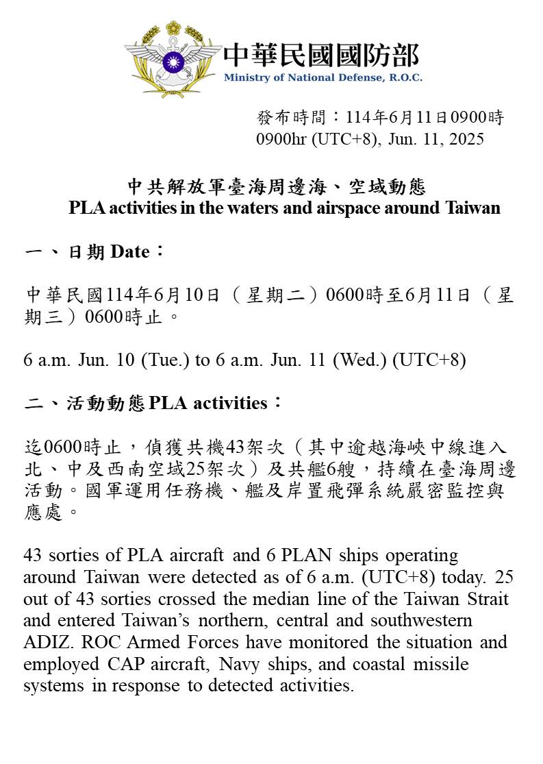 迄0600時止,偵獲共機43架次(其中逾越海峽中線進入北、中及西南空域25架次)及共艦6艘,持續在臺海周邊活動。國軍運用任務機、艦及岸置飛彈系統嚴密監控與應處。