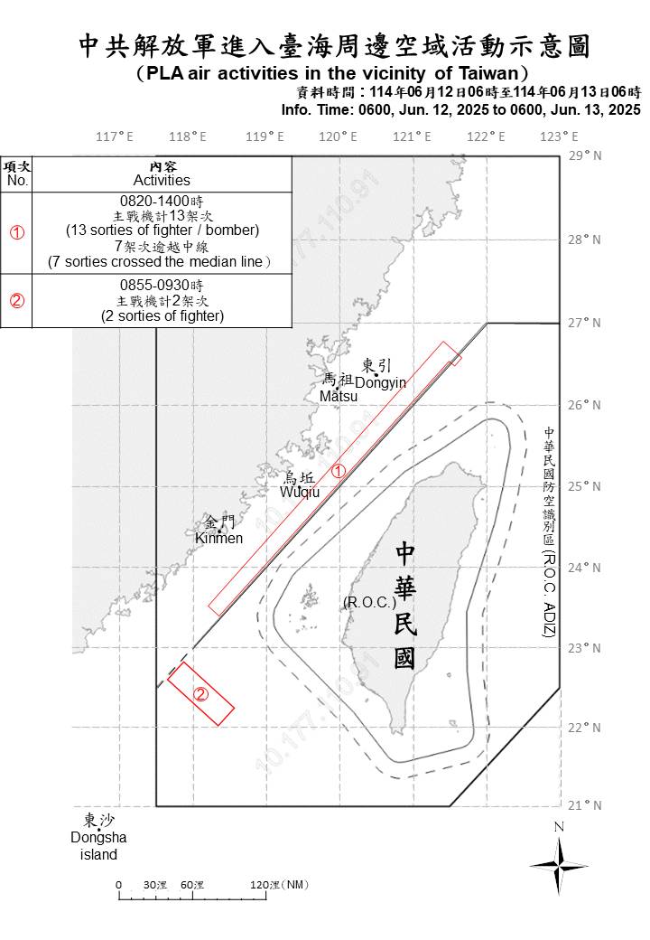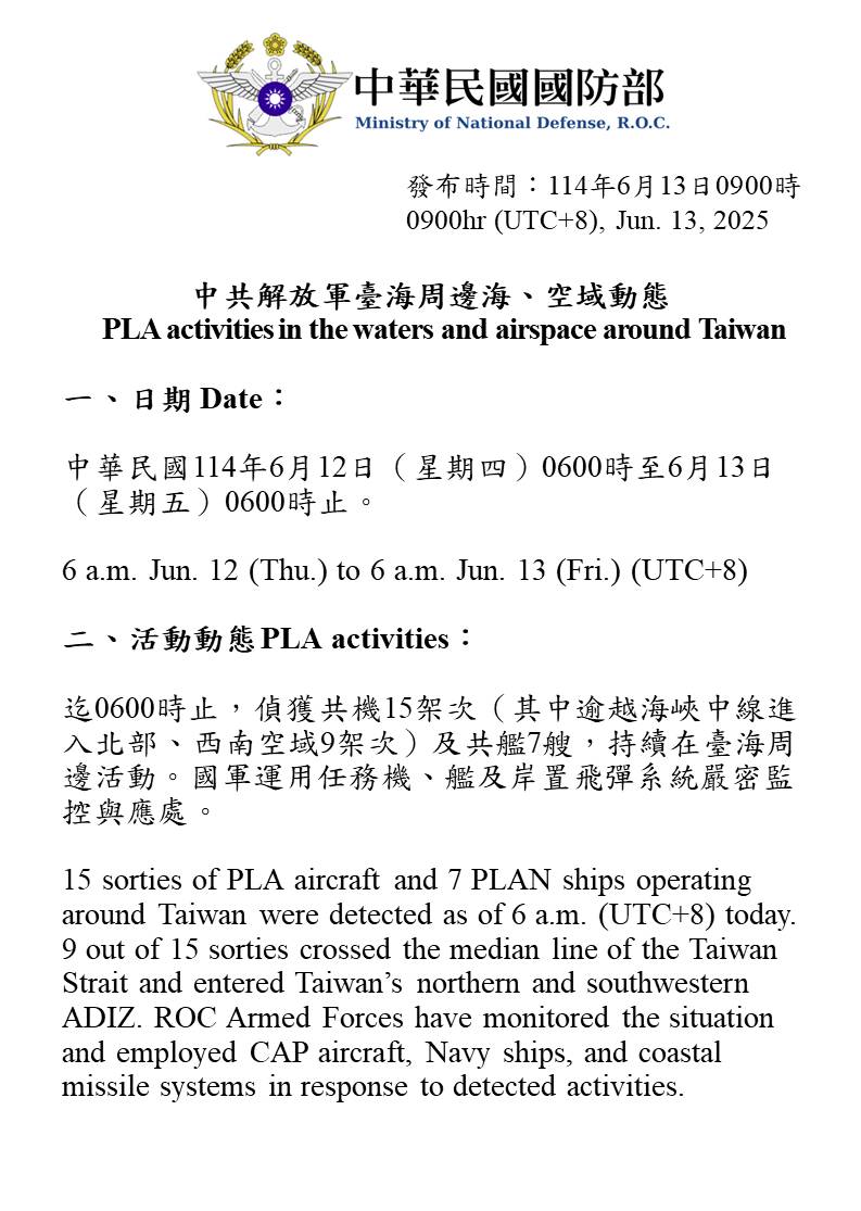 迄0600時止,偵獲共機15架次(其中逾越海峽中線進入北部、西南空域9架次)及共艦7艘,持續在臺海周邊活動。國軍運用任務機、艦及岸置飛彈系統嚴密監控與應處。