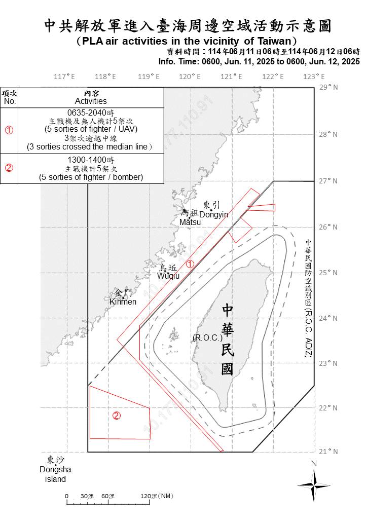 迄0600時止,偵獲共機10架次(其中逾越海峽中線進入北部、西南空域8架次)及共艦7艘,持續在臺海周邊活動。國軍運用任務機、艦及岸置飛彈系統嚴密監控與應處。