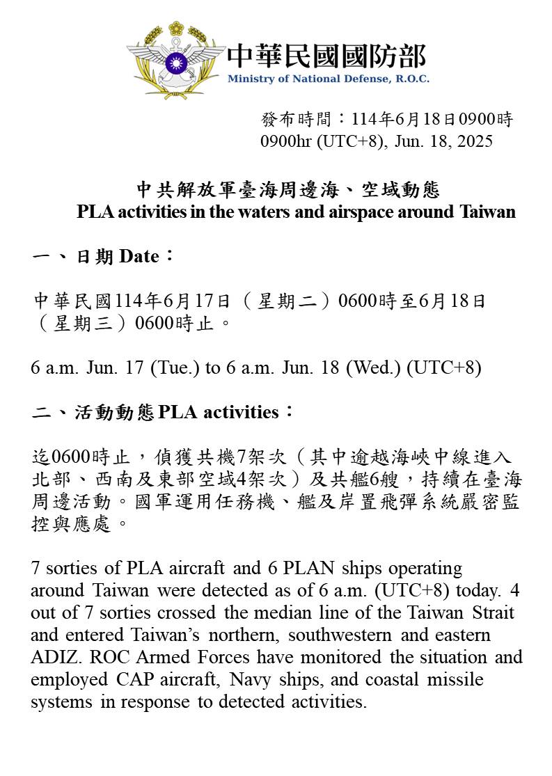 迄0600時止,偵獲共機7架次(其中逾越海峽中線進入北部、西南及東部空域4架次)及共艦6艘,持續在臺海周邊活動。國軍運用任務機、艦及岸置飛彈系統嚴密監控與應處。
