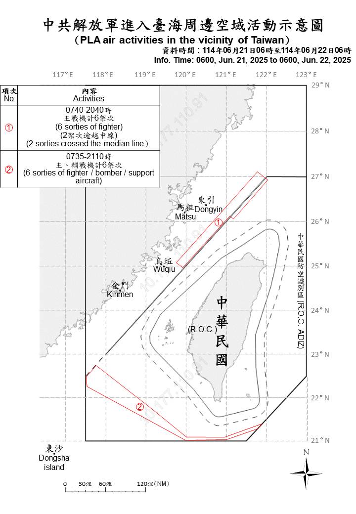 迄0600時止,偵獲共機12架次(其中逾越海峽中線,進入我北、西南及東南部空域8架次)及共艦6艘,持續在臺海周邊活動。國軍運用任務機、艦及岸置飛彈系統嚴密監控與應處。