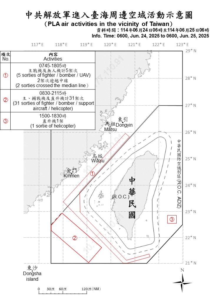 迄0600時止,偵獲共機37架次(其中逾越海峽中線進入西南及東南空域34架次)及共艦6艘,持續在臺海周邊活動。國軍運用任務機、艦及岸置飛彈系統嚴密監控與應處。
