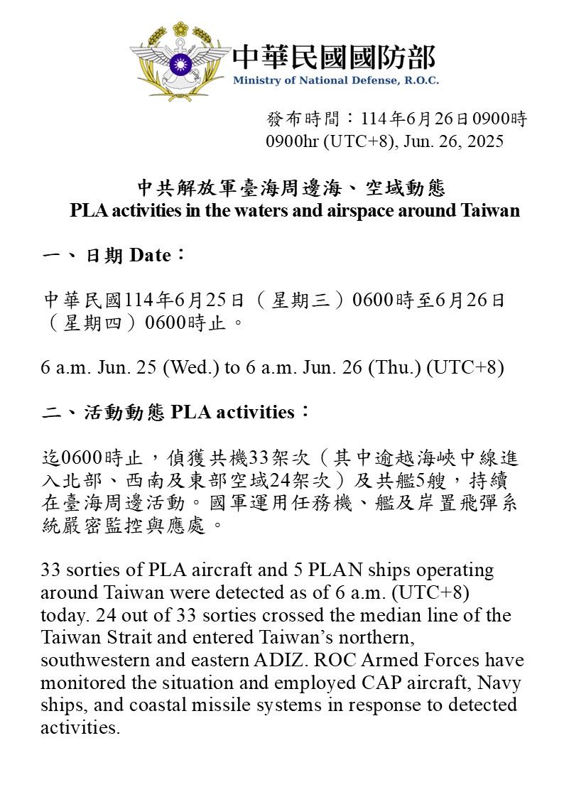 迄0600時止,偵獲共機33架次(其中逾越海峽中線進入北部、西南及東部空域24架次)及共艦5艘,持續在臺海周邊活動。國軍運用任務機、艦及岸置飛彈系統嚴密監控與應處。