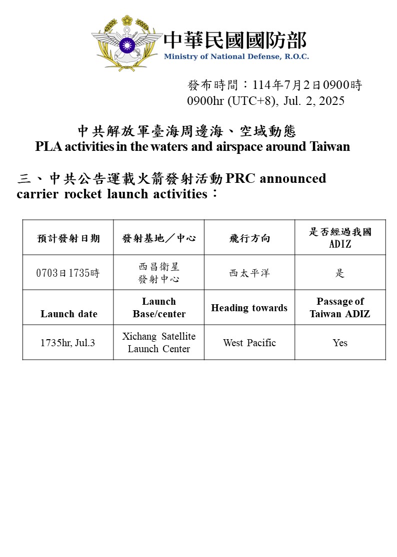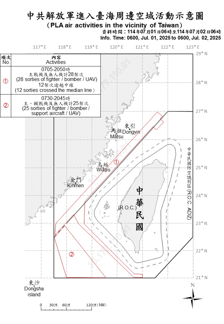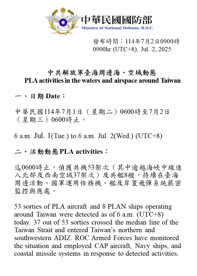 迄0600時止,偵獲共機53架次(其中逾越海峽中線進入北部及西南空域37架次)及共艦8艘,持續在臺海周邊活動。國軍運用任務機、艦及岸置飛彈系統嚴密監控與應處。
