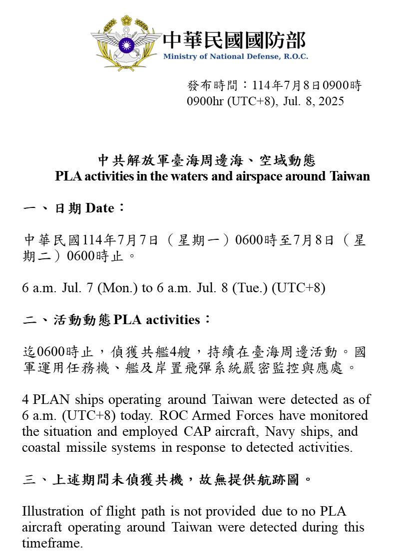迄0600時止,偵獲共艦4艘,持續在臺海周邊活動。國軍運用任務機、艦及岸置飛彈系統嚴密監控與應處。
