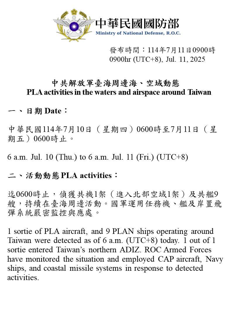 迄0600時止,偵獲共機1架(進入北部空域1架)及共艦9艘,持續在臺海周邊活動。國軍運用任務機、艦及岸置飛彈系統嚴密監控與應處。