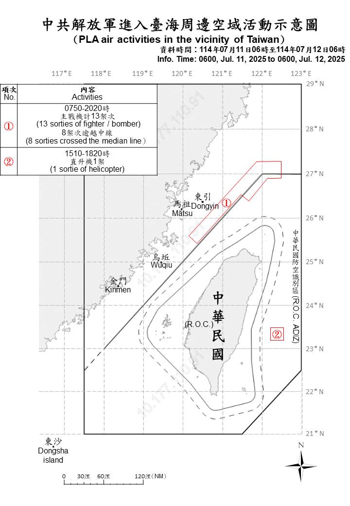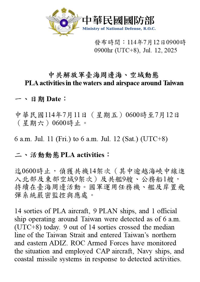 迄0600時止,偵獲共機14架次(其中逾越海峽中線進入北部及東部空域9架次)及共艦9艘、公務船1艘,持續在臺海周邊活動。國軍運用任務機、艦及岸置飛彈系統嚴密監控與應處。