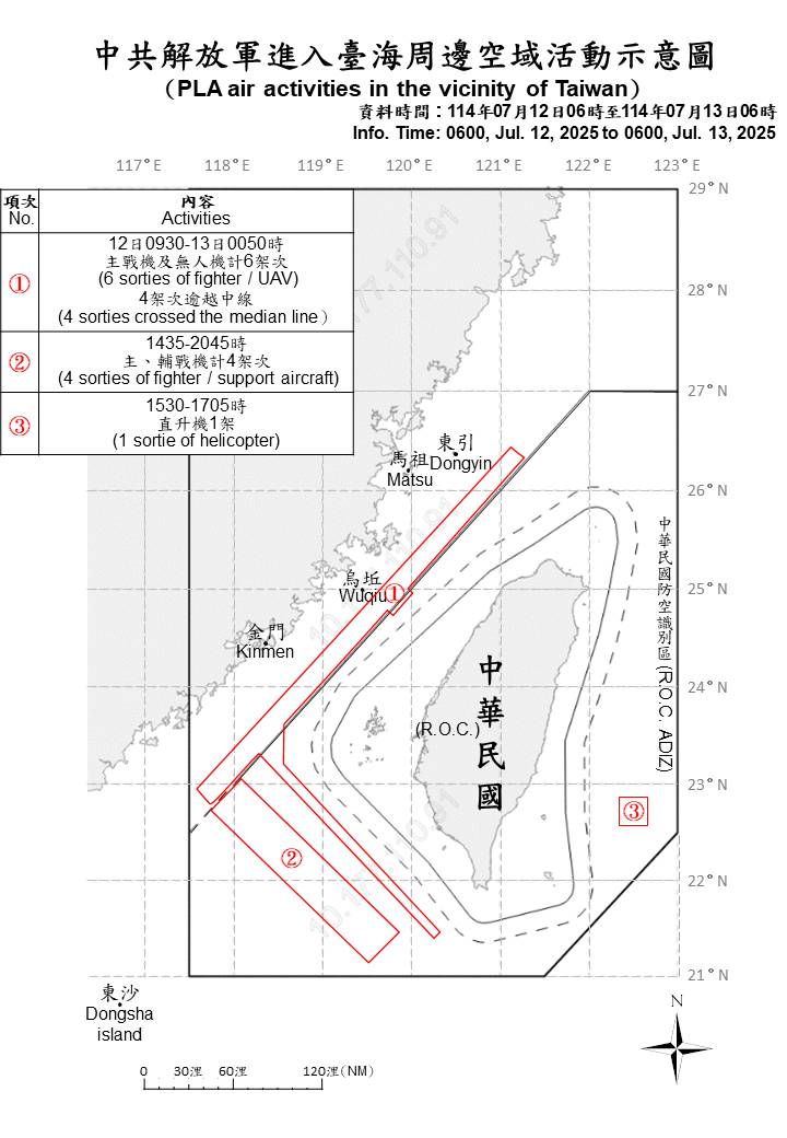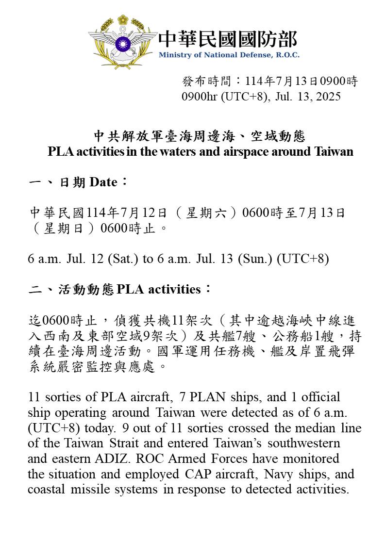 迄0600時止,偵獲共機11架次(其中逾越海峽中線進入西南及東部空域9架次)及共艦7艘、公務船1艘,持續在臺海周邊活動。國軍運用任務機、艦及岸置飛彈系統嚴密監控與應處。