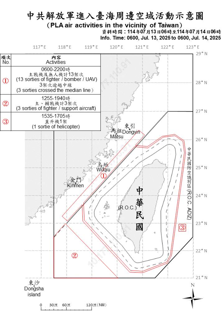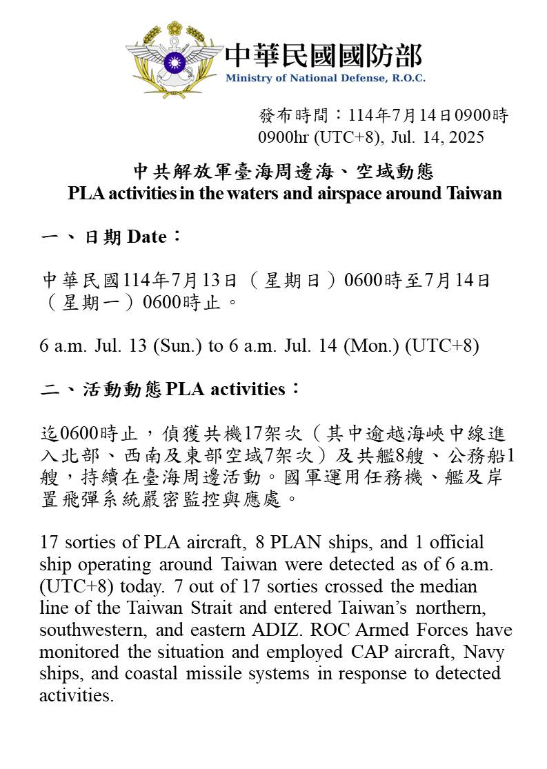 迄0600時止,偵獲共機17架次(其中逾越海峽中線進入北部、西南及東部空域7架次)及共艦8艘、公務船1艘,持續在臺海周邊活動。國軍運用任務機、艦及岸置飛彈系統嚴密監控與應處。