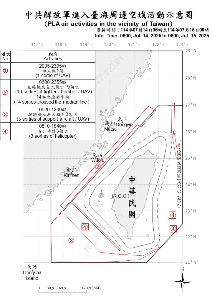 迄0600時止,偵獲共機26架次(其中逾越海峽中線進入北部、西南及東部空域21架次)及共艦7艘、公務船1艘,持續在臺海周邊活動。國軍運用任務機、艦及岸置飛彈系統嚴密監控與應處。