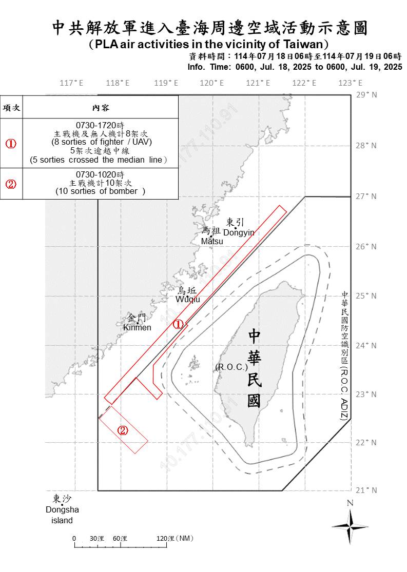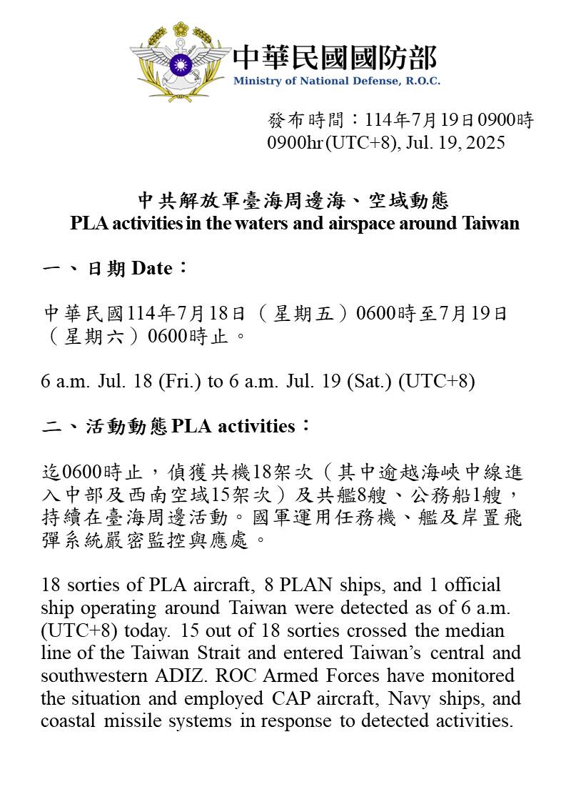 迄0600時止,偵獲共機18架次(其中逾越海峽中線進入中部及西南空域15架次)及共艦8艘、公務船1艘,持續在臺海周邊活動。國軍運用任務機、艦及岸置飛彈系統嚴密監控與應處。
