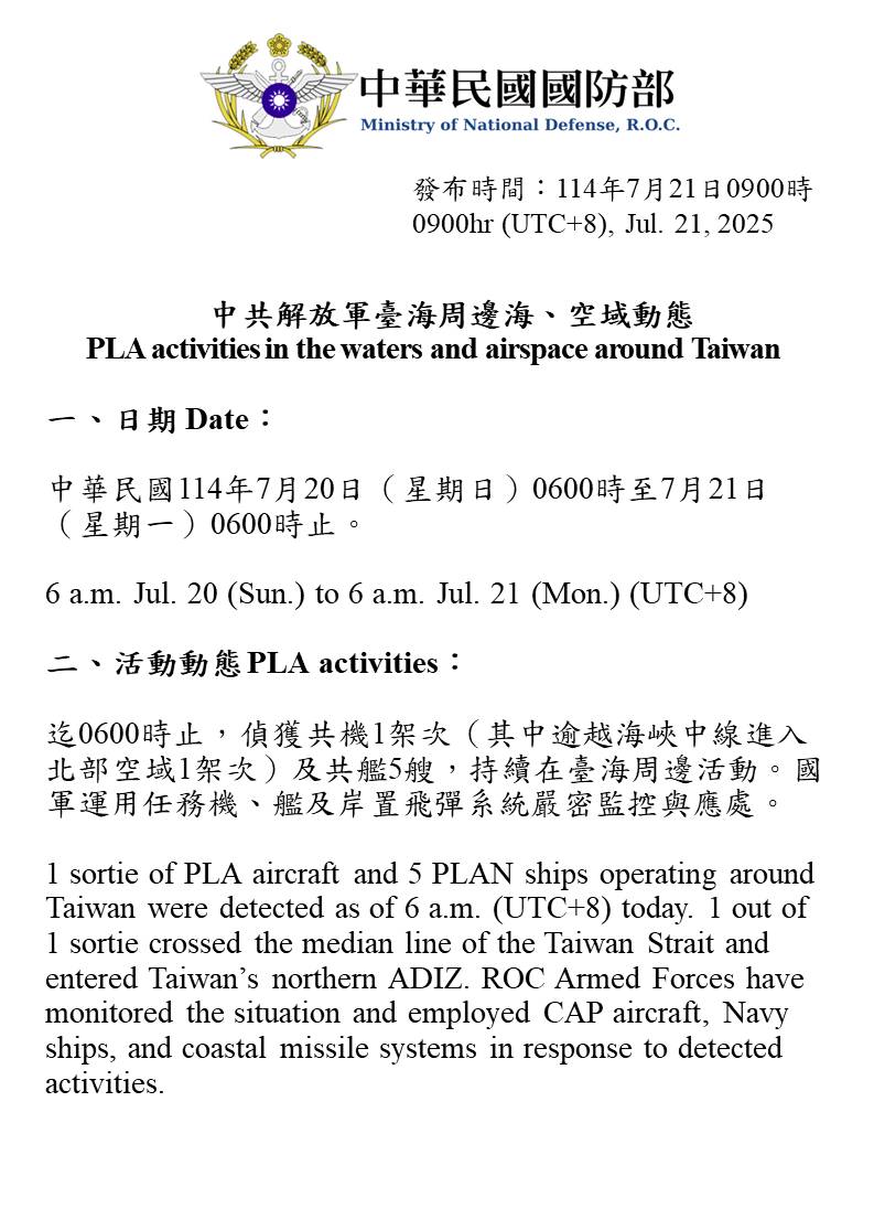 迄0600時止,偵獲共機1架次(其中逾越海峽中線進入北部空域1架次)及共艦5艘,持續在臺海周邊活動。國軍運用任務機、艦及岸置飛彈系統嚴密監控與應處。