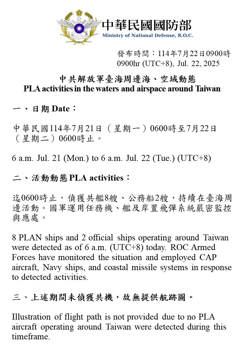 迄0600時止,偵獲共艦8艘、公務船2艘,持續在臺海周邊活動。國軍運用任務機、艦及岸置飛彈系統嚴密監控與應處。