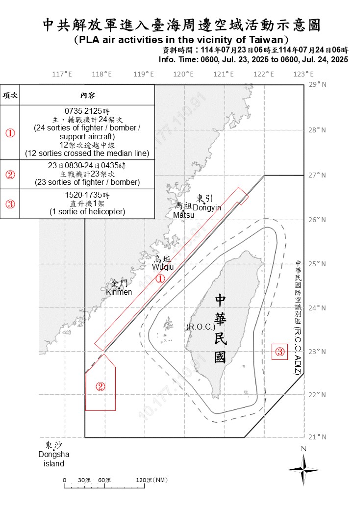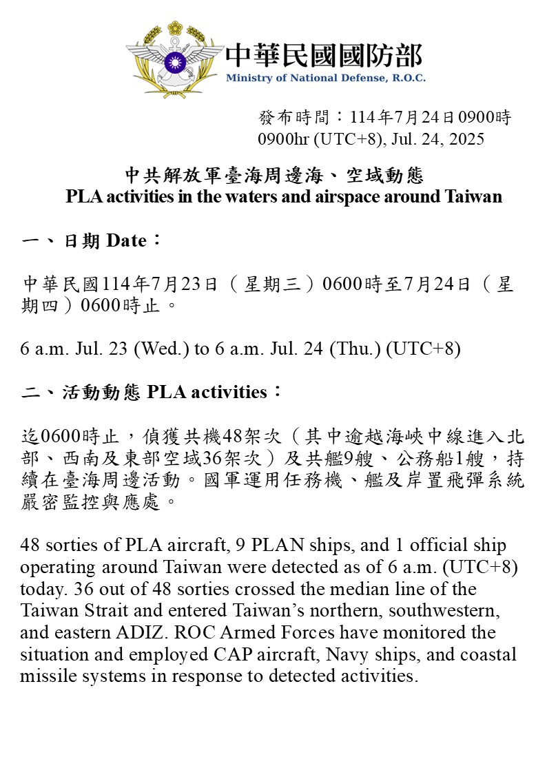 迄0600時止,偵獲共機48架次(其中逾越海峽中線進入北部、西南及東部空域36架次)及共艦9艘、公務船1艘,持續在臺海周邊活動。國軍運用任務機、艦及岸置飛彈系統嚴密監控與應處。