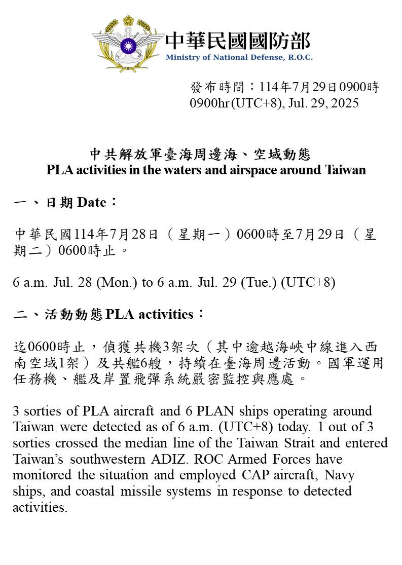 迄0600時止,偵獲共機3架次(其中逾越海峽中線進入西南空域1架)及共艦6艘,持續在臺海周邊活動。國軍運用任務機、艦及岸置飛彈系統嚴密監控與應處。