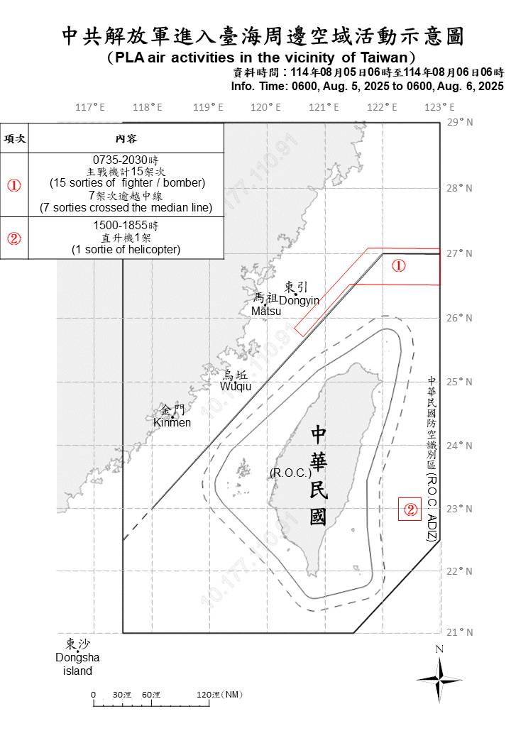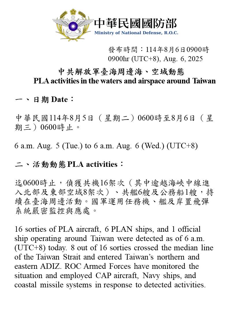迄0600時止,偵獲共機16架次(其中逾越海峽中線進入北部及東部空域8架次)、共艦6艘及公務船1艘,持續在臺海周邊活動。國軍運用任務機、艦及岸置飛彈系統嚴密監控與應處。