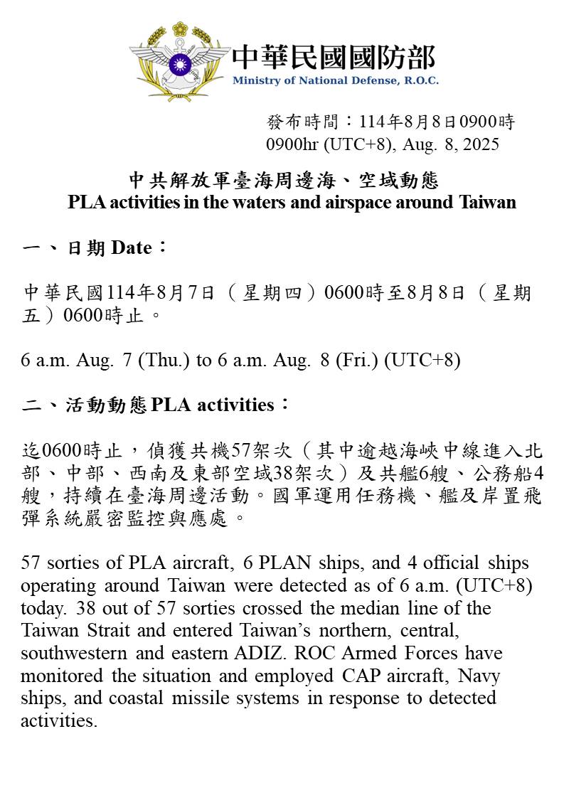 迄0600時止,偵獲共機57架次(其中逾越海峽中線進入北部、中部、西南及東部空域38架次)及共艦6艘、公務船4艘,持續在臺海周邊活動。國軍運用任務機、艦及岸置飛彈系統嚴密監控與應處。