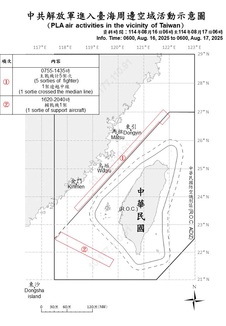 迄0600時止,偵獲共機6架次(其中逾越海峽中線進入北部及西南空域2架次)、共艦5艘,持續在臺海周邊活動。國軍運用任務機、艦及岸置飛彈系統嚴密監控與應處。