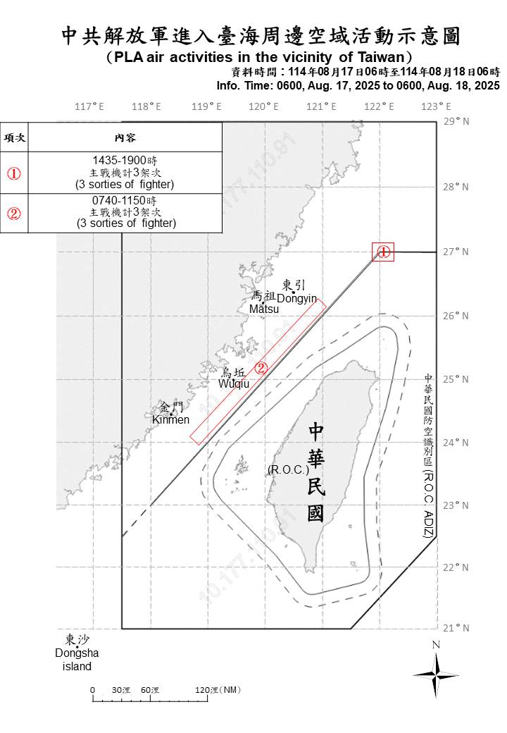 迄0600時止,偵獲共機6架次(其中逾越海峽中線進入北部空域3架次)及共艦5艘,持續在臺海周邊活動。國軍運用任務機、艦及岸置飛彈系統嚴密監控與應處。