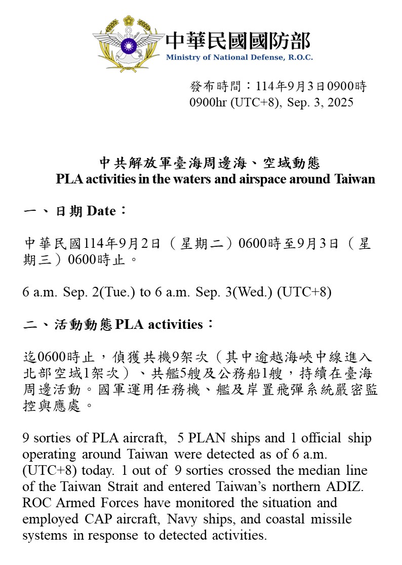 迄0600時止,偵獲共機9架次(其中逾越海峽中線進入北部空域1架次)、共艦5艘及公務船1艘,持續在臺海周邊活動。國軍運用任務機、艦及岸置飛彈系統嚴密監控與應處。