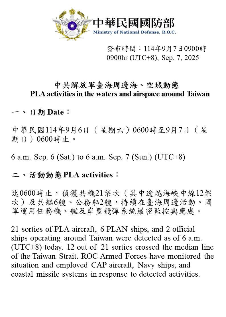 迄0600時止,偵獲共機21架次(其中逾越海峽中線12架次)及共艦6艘、公務船2艘,持續在臺海周邊活動。國軍運用任務機、艦及岸置飛彈系統嚴密監控與應處。