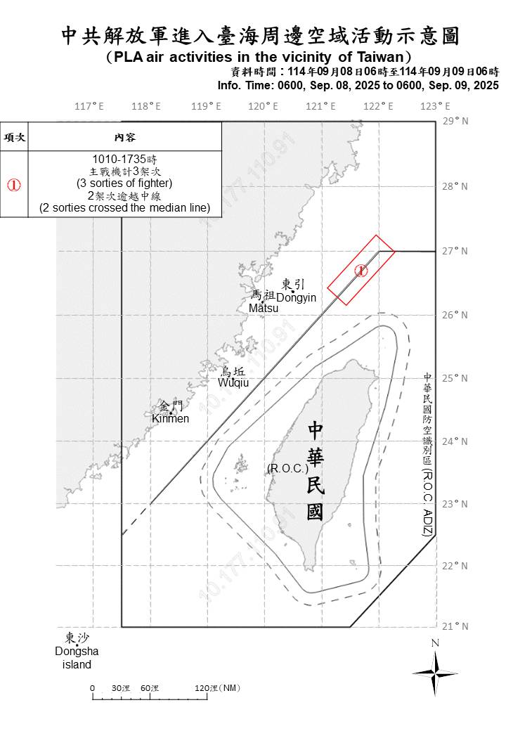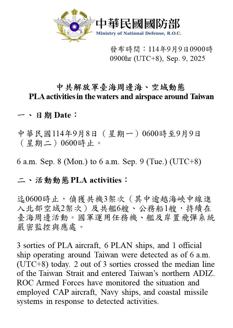 迄0600時止,偵獲共機3架次(其中逾越海峽中線進入北部空域2架次)及共艦6艘、公務船1艘,持續在臺海周邊活動。國軍運用任務機、艦及岸置飛彈系統嚴密監控與應處。