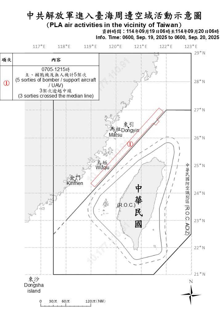 迄0600時止,偵獲共機5架次(其中逾越海峽中線進入北部空域3架次)及共艦5艘,持續在臺海周邊活動。國軍運用任務機、艦及岸置飛彈系統嚴密監控與應處。