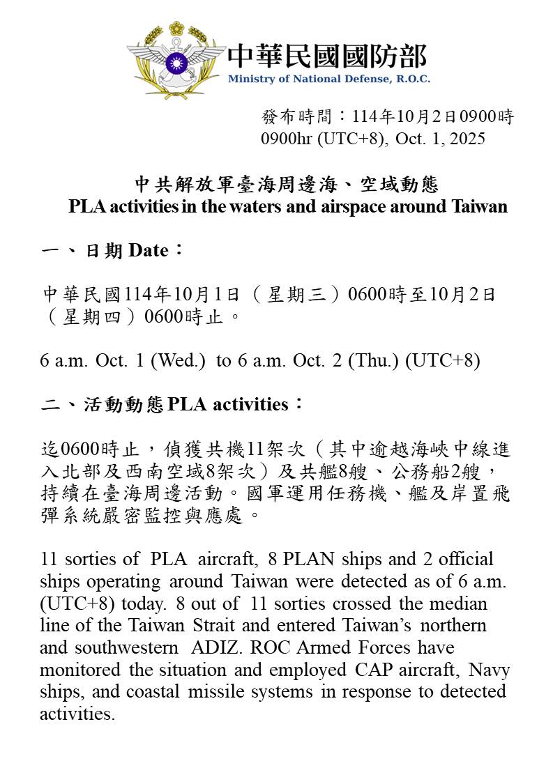 迄0600時止,偵獲共機11架次(其中逾越海峽中線進入北部及西南空域8架次)及共艦8艘、公務船2艘,持續在臺海周邊活動。國軍運用任務機、艦及岸置飛彈系統嚴密監控與應處。