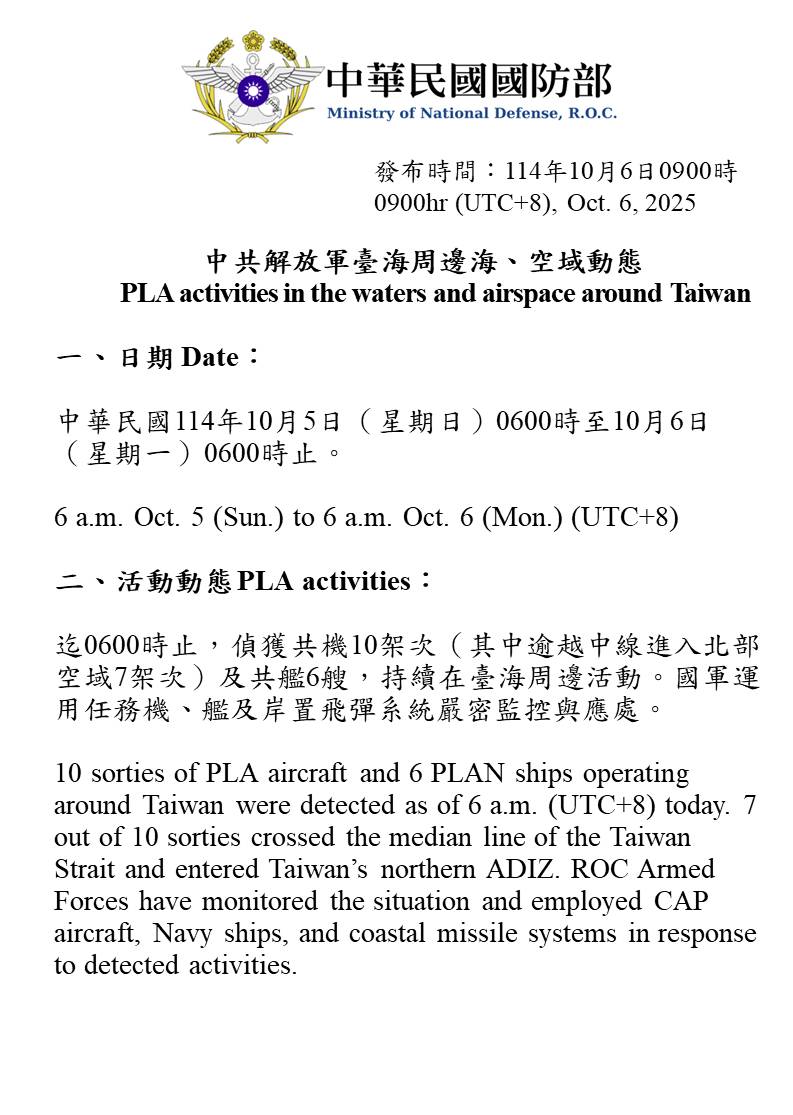 迄0600時止,偵獲共機10架次(其中逾越中線進入北部空域7架次)及共艦6艘,持續在臺海周邊活動。國軍運用任務機、艦及岸置飛彈系統嚴密監控與應處。