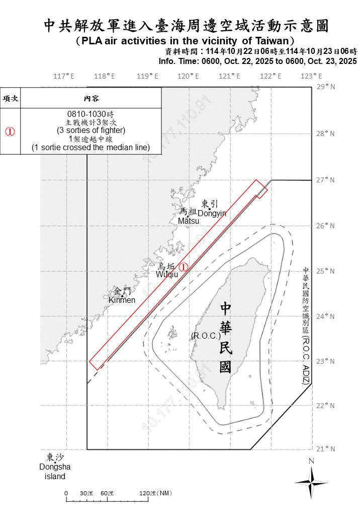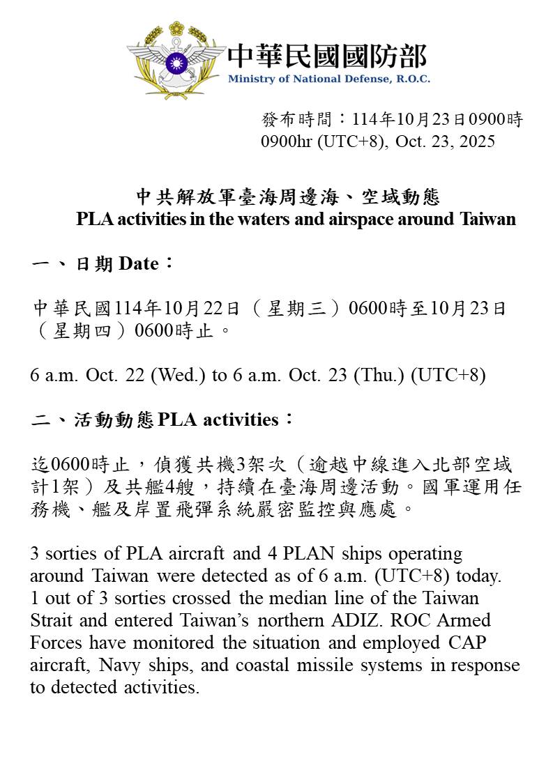 迄0600時止,偵獲共機3架次(逾越中線進入北部空域計1架)及共艦4艘,持續在臺海周邊活動。國軍運用任務機、艦及岸置飛彈系統嚴密監控與應處。