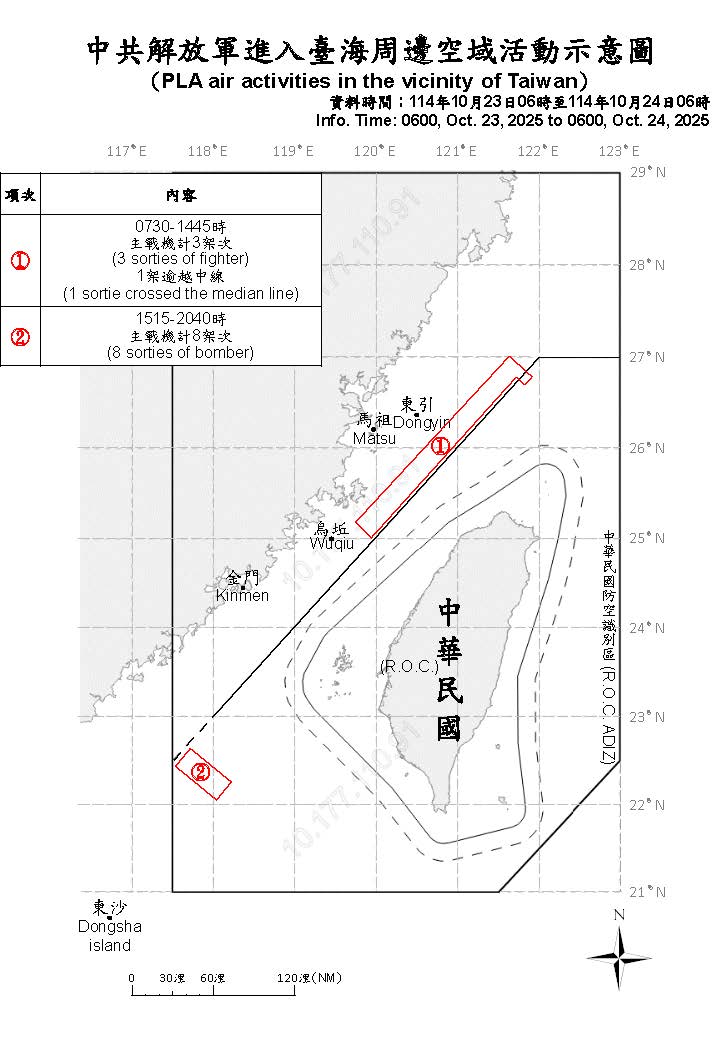 迄0600時止,偵獲共機11架次(逾越中線進入北部及西南空域9架次)及共艦4艘,持續在臺海周邊活動。國軍運用任務機、艦及岸置飛彈系統嚴密監控與應處。