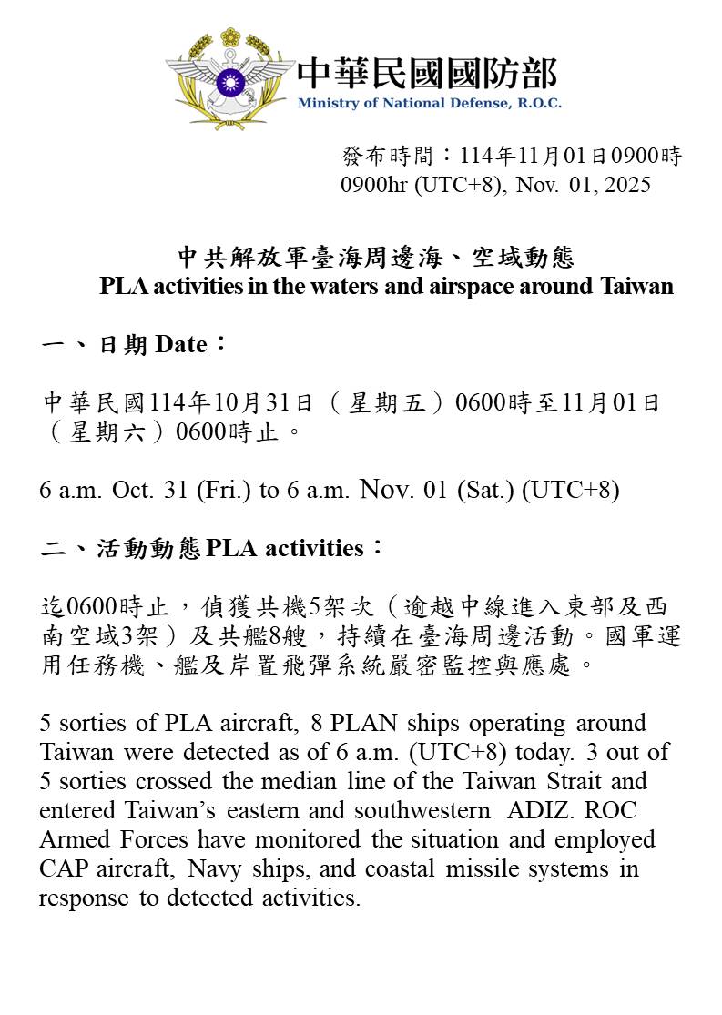 迄0600時止,偵獲共機5架次(逾越中線進入東部及西南空域3架)及共艦8艘,持續在臺海周邊活動。國軍運用任務機、艦及岸置飛彈系統嚴密監控與應處。
