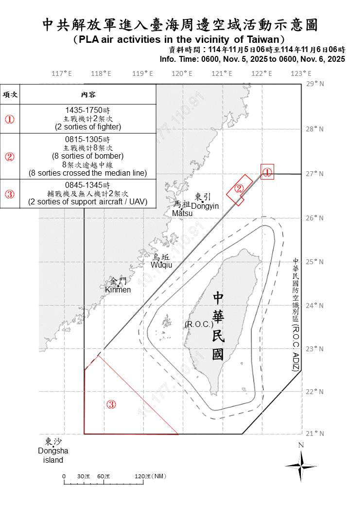 迄0600時止,偵獲共機12架次(逾越中線進入北部及西南空域12架次)及共艦10艘,持續在臺海周邊活動。國軍運用任務機、艦及岸置飛彈系統嚴密監控與應處。