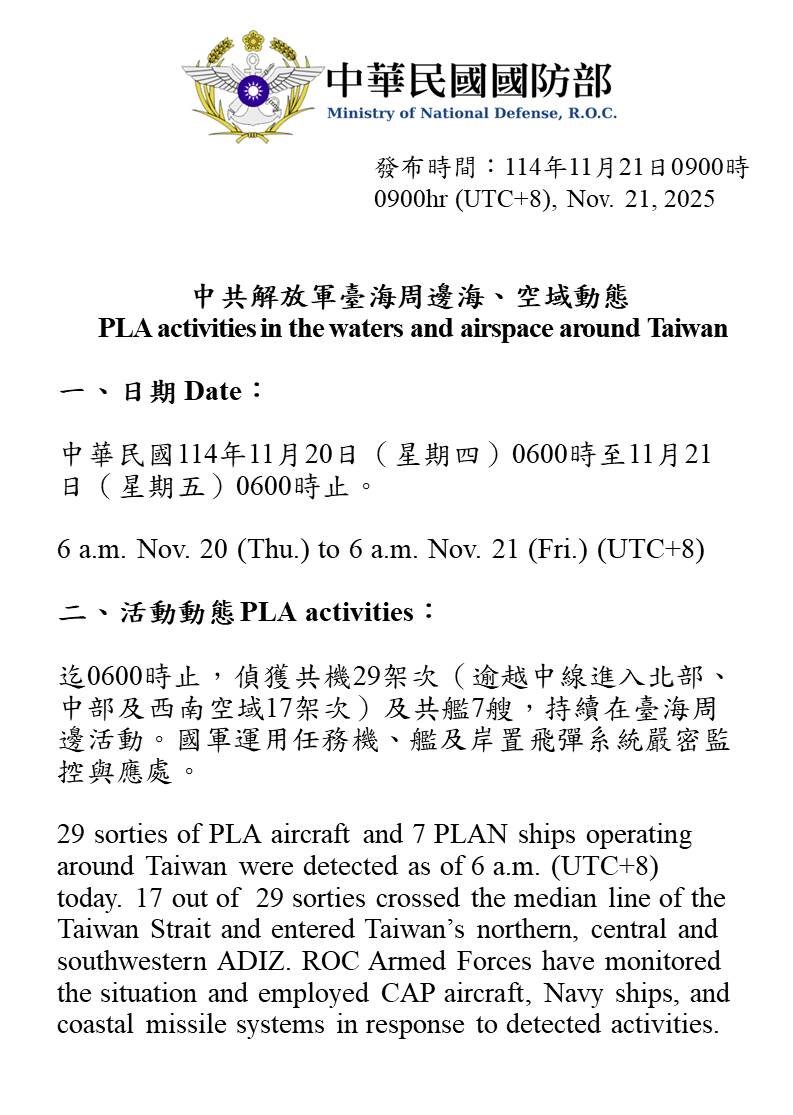迄0600時止,偵獲共機29架次(逾越中線進入北部、中部及西南空域17架次)及共艦7艘,持續在臺海周邊活動。國軍運用任務機、艦及岸置飛彈系統嚴密監控與應處。