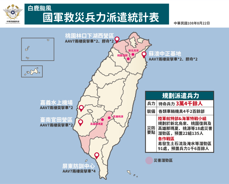 國防部指出,國軍目前待命兵力3萬4千餘人、各類車輛機具4千2百餘部;另於林口下湖西營區、蘇澳中正基地各預置AAV7兩棲突擊車2輛、膠舟2艘,均已完成整備工作,可依令執行災防任務。