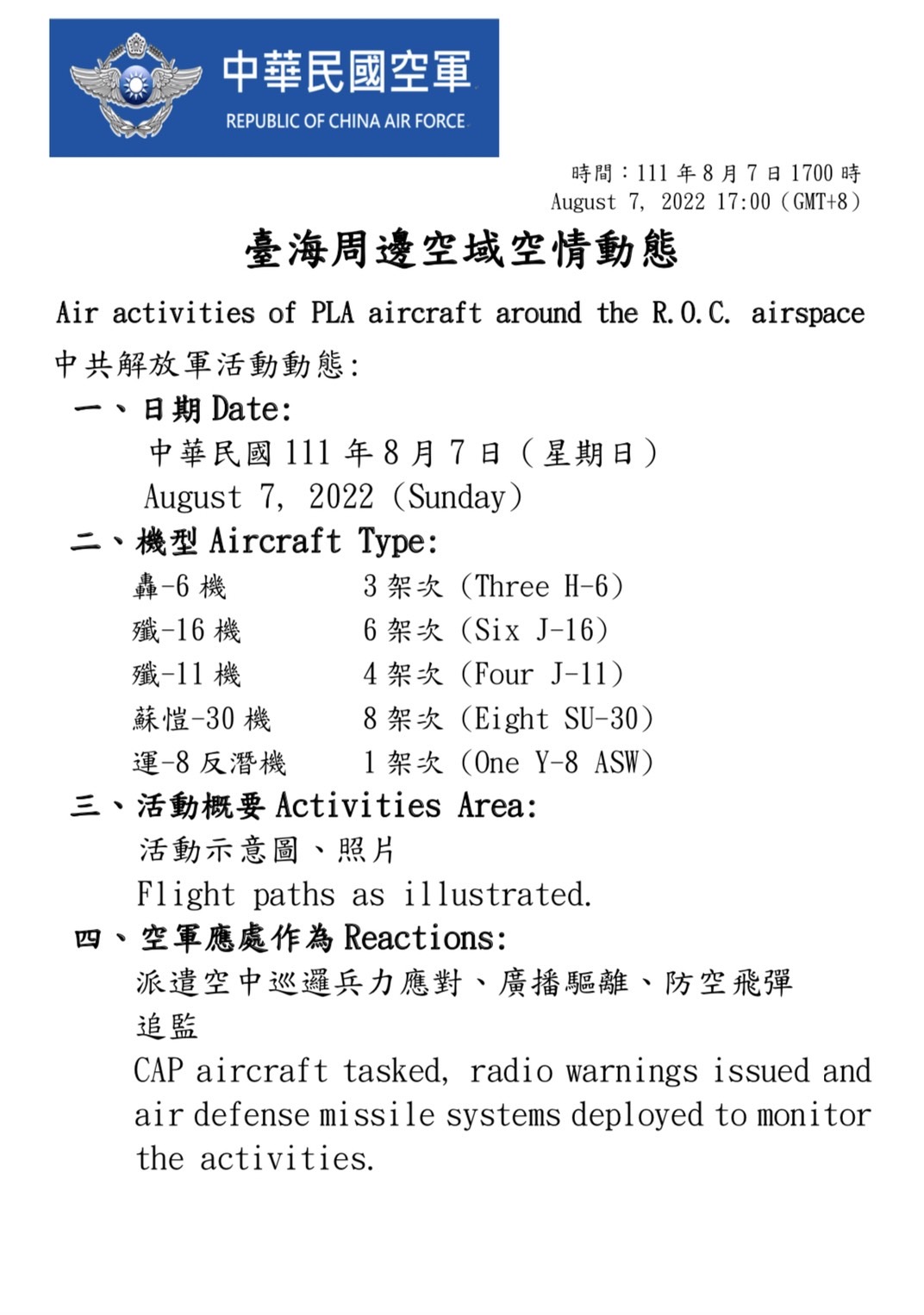 國防部今(8)日表示,迄1700時止,偵獲共機39架次(其中逾越海峽中線及其延伸線進入西南空域21架次)、共艦13艘次,持續在臺海周邊活動,進行聯合海空行動。國軍運用聯合情監偵系統嚴密監控敵情狀況,除廣播示警並以空中偵巡兵力、海軍艦艇,以及岸置飛彈適切應處。